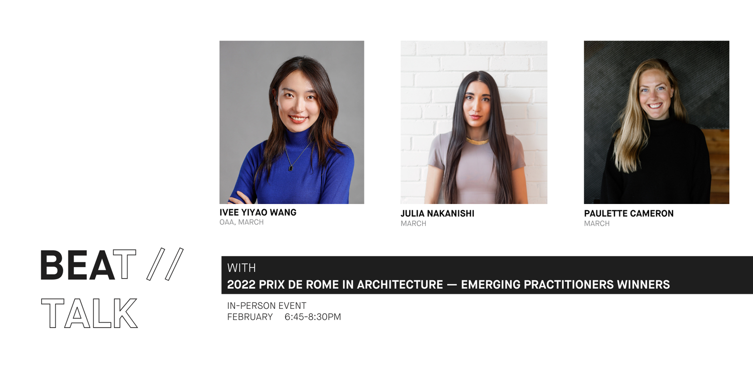 Join Building Equality in Architecture Toronto (BEAT) for a round table discussion as we hear from three 2022 Prix De Rome in Architecture – Emerging Practitioner winners: Ivee Wang, Julia Nakanishi, and Paulette Cameron. The speakers will expand on their unique trajectories in research and professional roles; discussing what sparked an interest in their research topic, and the amazing projects and initiatives they’ve worked on along the way.