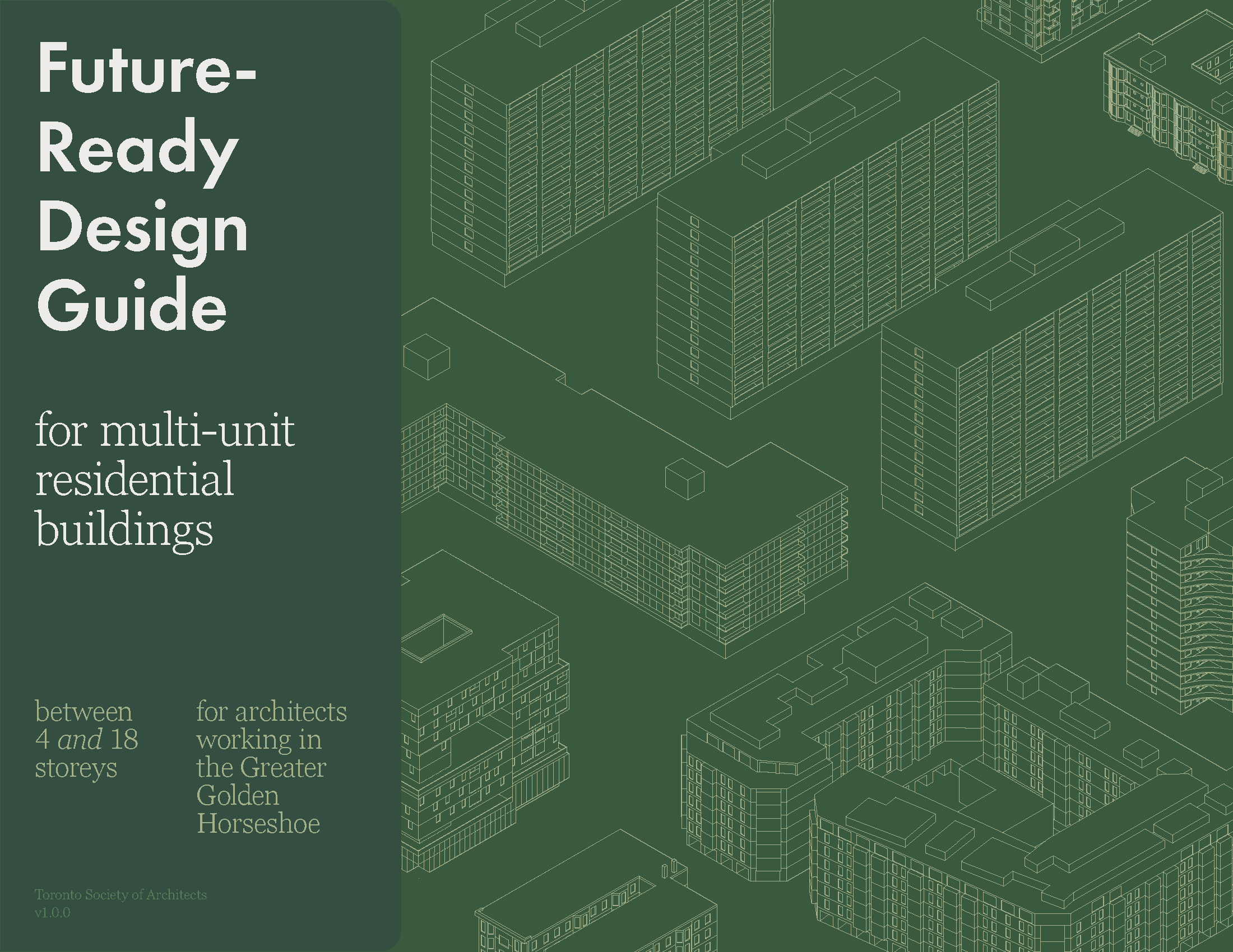 The Future-Ready Design Guide (FRDG) for Multi-Unit Residential Buildings (MURBs) is a new, free resource developed by the Toronto Society of Architects (TSA) and funded by The Atmospheric Fund (TAF) that provides designers with holistic, actionable insights for early-stage housing design (when design decisions are most impactful). Bringing together the insight of over 240 resources and tailored to multi-unit residential buildings between 4 and 18 storeys, it is the first guide of its kind that focuses specifically on the Greater Golden Horseshoe region and its unique challenges and opportunities.